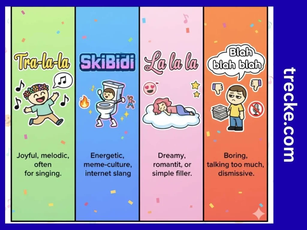 | Tra-la-la | Playful singing sound | Music, humor |